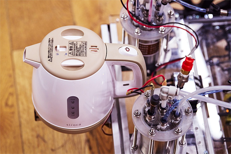 「お茶の魔ケトルはサイズが大きいので、お金がかかっているように見えますが、Creative Loungeにあったアクリルの端材や木材、社内で不要になった部品などが使われています。お金のかかるヒーターや回路基板はここで自作しました。ボイラーは、少ない蒸気でも温度変化を少なく安定させ、さらに安いということで市販の真空タンブラーにたどりつきました」(黒田)