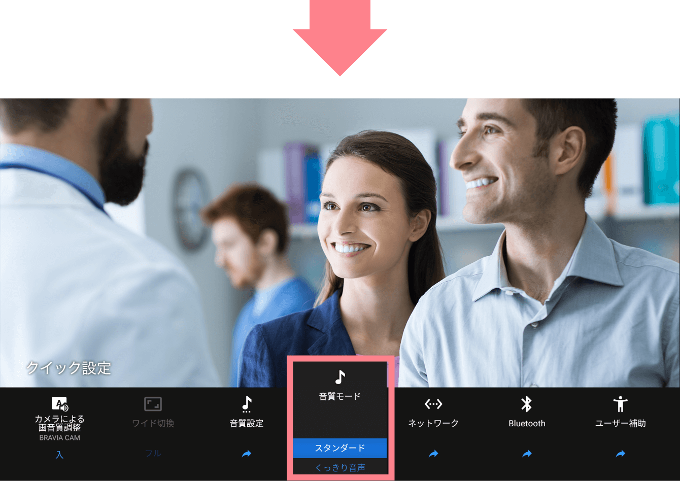 たとえば音楽ライブを見るときはコンサートホールのような響きに、スポーツ中継を見るときは臨場感が伝わるように、映画を見るときは劇場のようなサラウンドにしたいと思いませんか。ブラビアなら、あらかじめ用意されている「音質モード」から、視聴するコンテンツに合わせて選ぶだけで簡単に設定できます。