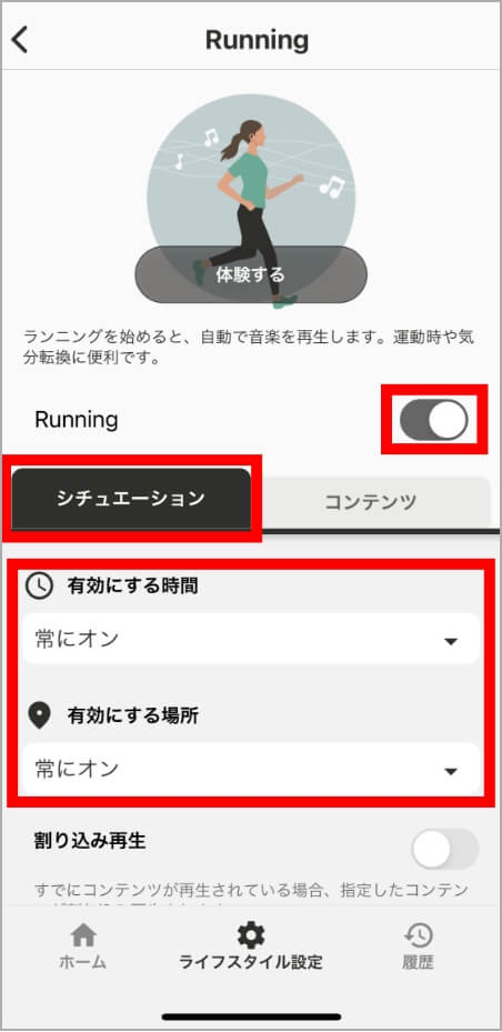 RunningをONにし、[シチュエーション]タブで「有効にする時間」と「有効にする場所」をそれぞれ設定。