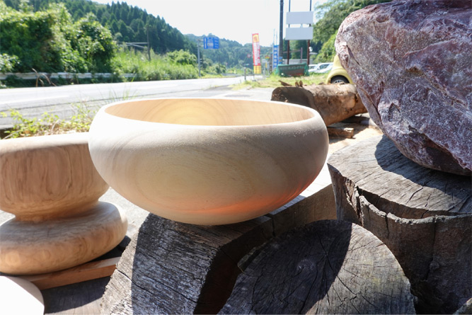 「木の外皮の部分をふちに残した仕上げは、ナチュラル・エッジと呼ばれるものです。すぐ近くに木をチップに加工する工場があって、そこで山桜や樫など、さまざまな木材を選ばせてもらって買っているのですが、重機を使って積み下ろしをする際などに、どうしても外皮が剥げてしまうことが多いので、こうした作品はなかなか数をつくることができません。白っぽい木材は榎(えのき)。通常はもっと黄色っぽいんですけど、こういう白いものがたまたま見つかって。実際に削ってみると、木くずが本当に真っ白で、雪のようにきれいだったので撮ってみたくなりました。動画は、ボウルをつくるためにターニングしているところです。やっぱり、丸太から切り出したときに、おおっと驚くような木目が現れる瞬間はたまらないですね。虫喰いや腐れがあっても、それを生かして、しっかり素材と相談しながら使い切れたときが、いちばんうれしいです」