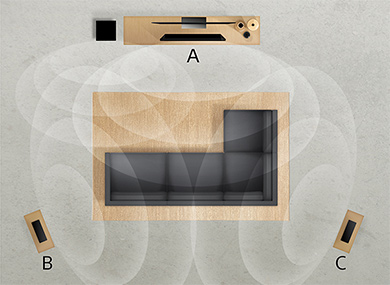 久保田:「ソファモード」では、サブウーファーをテレビの横の、本来あるべき位置に置いた時の音をリファレンスに、音質の最適化を行っています。サブウーファーがソファのぶ厚い座面の下にあることで減衰されてしまう音や、逆に強調されてしまう音を補正しているほか、視聴距離の最適化も行っています。もちろんソファの素材や形状によって微妙に聞こえ方は変わってくるのですが、多数のソファで実験を行い、見つけ出した“最大公約数”的な解を盛りこみました。