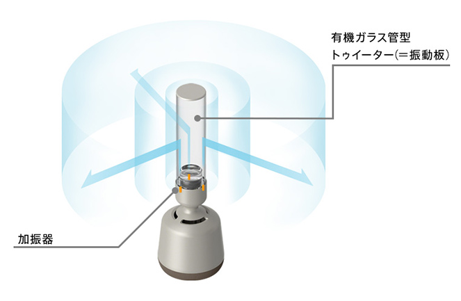 鈴木:1つめは、高域の音波と中域の音波の放射方向を合わせたという点です。まず、この透明の有機ガラス管を使ったトゥイーターの駆動方式である「バーティカルドライブテクノロジー」は、入力信号に応じて、振動板の端面に配置された加振器が縦(垂直)に振動し、有機ガラス管の端面を物理的に「たたく」ことにより、クリアな音を管全体から360度の全方向に放射できるというものです。この「たたく」という動作原理は、打楽器や弦楽器を物理的に指ではじいたり、たたいて音を出す仕組みととてもよく似ているんですよ。