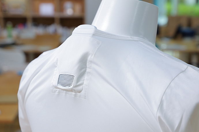 伊藤健二:『REON POCKET』の入れやすさです。ポケットの形状を工夫することで、装着時に必ず口が開き、スルッと入れられるようにしています。また、きちんと『REON POCKET』が首もとに密着するよう、一般的なインナーウェアよりも後ろの半身の肩幅を少し絞ってもらっています。
