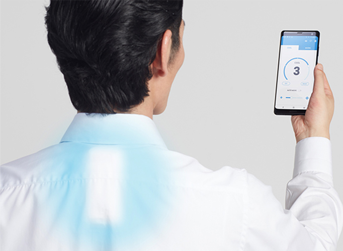 また、ソニーのR&Dセンター(研究開発部門)が開発し、さまざまなウェアラブルデバイスで採用されている行動検出アルゴリズムを『REON POCKET』にも採り入れています。このアルゴリズムを使うと、内蔵された加速度センサーで装着者が歩いているのか止まっているのかを瞬時に判定できるので、出勤時、歩き始めは冷感を弱めに設定し、そこから徐々にレベルを上げていき、駅に到着して足を止めたころ、最も暑さを感じるところで冷却力を最大にするということをやっています(AUTO MODEの場合。そのほか、ユーザーが5段階に温度を調整できるマニュアルモードもご利用いただけます)。