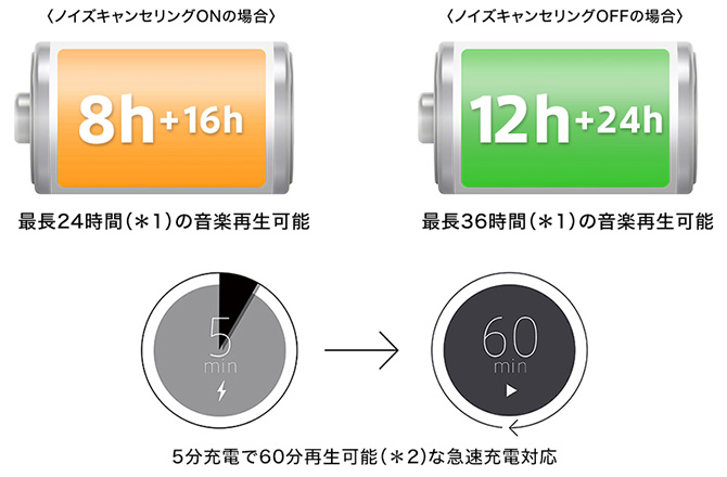 <ノイズキャンセリングONの場合>最長24時間(*1)の音楽再生可能 <ノイズキャンセリングOFFの場合>最長36時間(*1)の音楽再生可能 5分充電で60分再生可能(*2)な急速充電対応