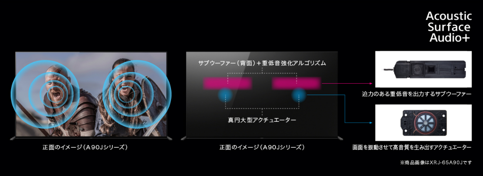 画面そのものから高音質を創出するソニー独自の音響技術「アコースティック サーフェス オーディオ プラス」を採用。アクチュエーターが画面を振動させることで、被写体の位置に合わせた音を作り出し、画面から直接届くリアリティーあるサウンドを実現しています。スリムなデザインでありながらも、包み込まれるような音で、その場にいるかのような映像体験を実現します。