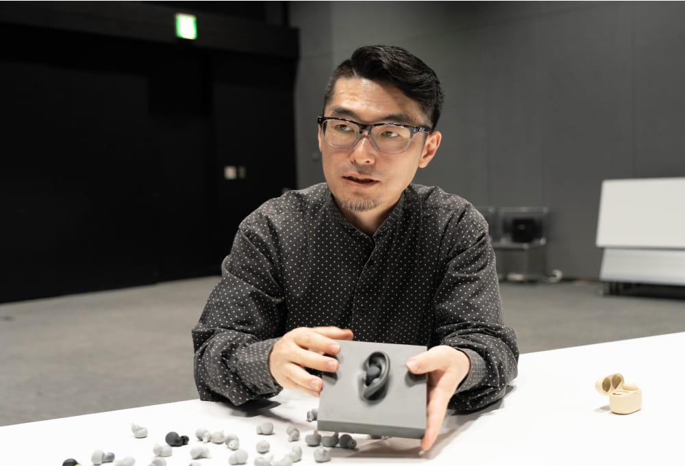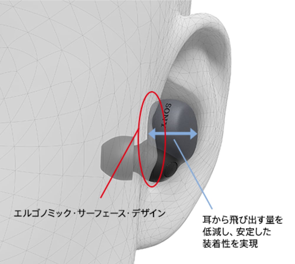 松原:重心が身体の中央に寄るので装着安定性が増し、頭を動かしてもズレたり外れたりしにくくなります。装着感も良くなるので快適性にも寄与しますね。なお、『LinkBuds S』では、『WF-1000XM4』で好評だったエルゴノミック・サーフェス・デザインを継続して採用しており、イヤホン本体を耳との接触面で支えることで安定性とフィット感を大きく高めています。これはソニーが持つ500例以上にわたる耳形状のデータがあればこそ実現できたことなんですよ。