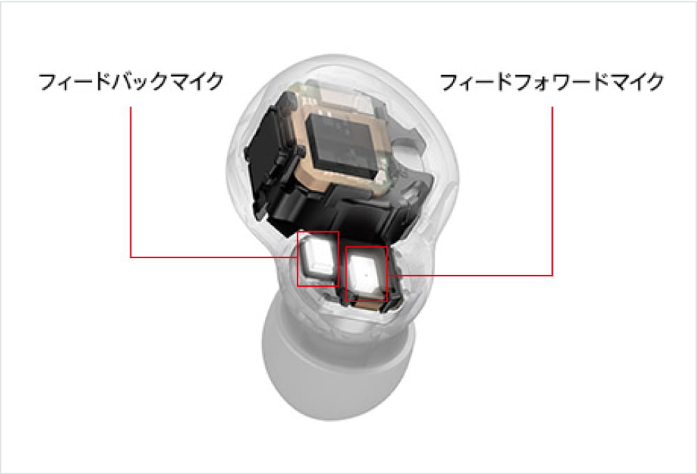 この際、外側に配置されているフィードフォワードマイクについては、屋外での利用時に風に吹かれてノイズキャンセリング性能が落ちてしまわないよう、風切り音を低減する筐体構造を実現しています。これによって、風が強い場所での音楽再生や音声通話時でも、ノイズキャンセリング性能を高いレベルで維持できるようにしています。