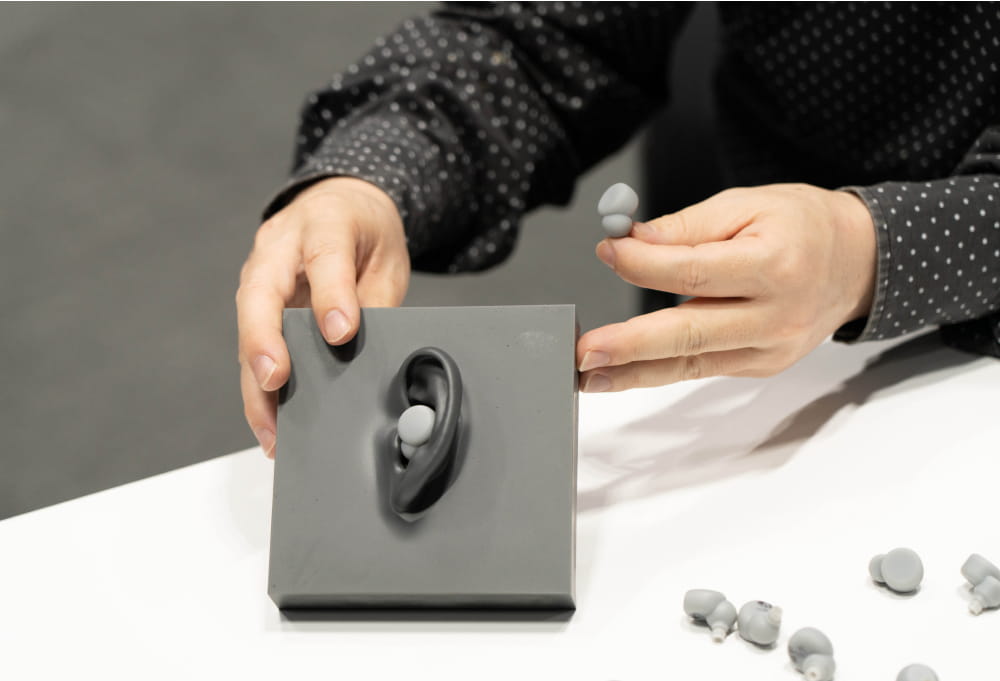 平野:はい。たくさんのモックアップを作成して最終的に行き着いたのが、ジオメトリックな球と円筒、2つの幾何形体を組み合わせたこの形状でした。もちろんただ組み合わせただけでなく、耳に装着した時に本体が耳の面に美しく沿うよう2つの形体の位置や角度を調整しています。