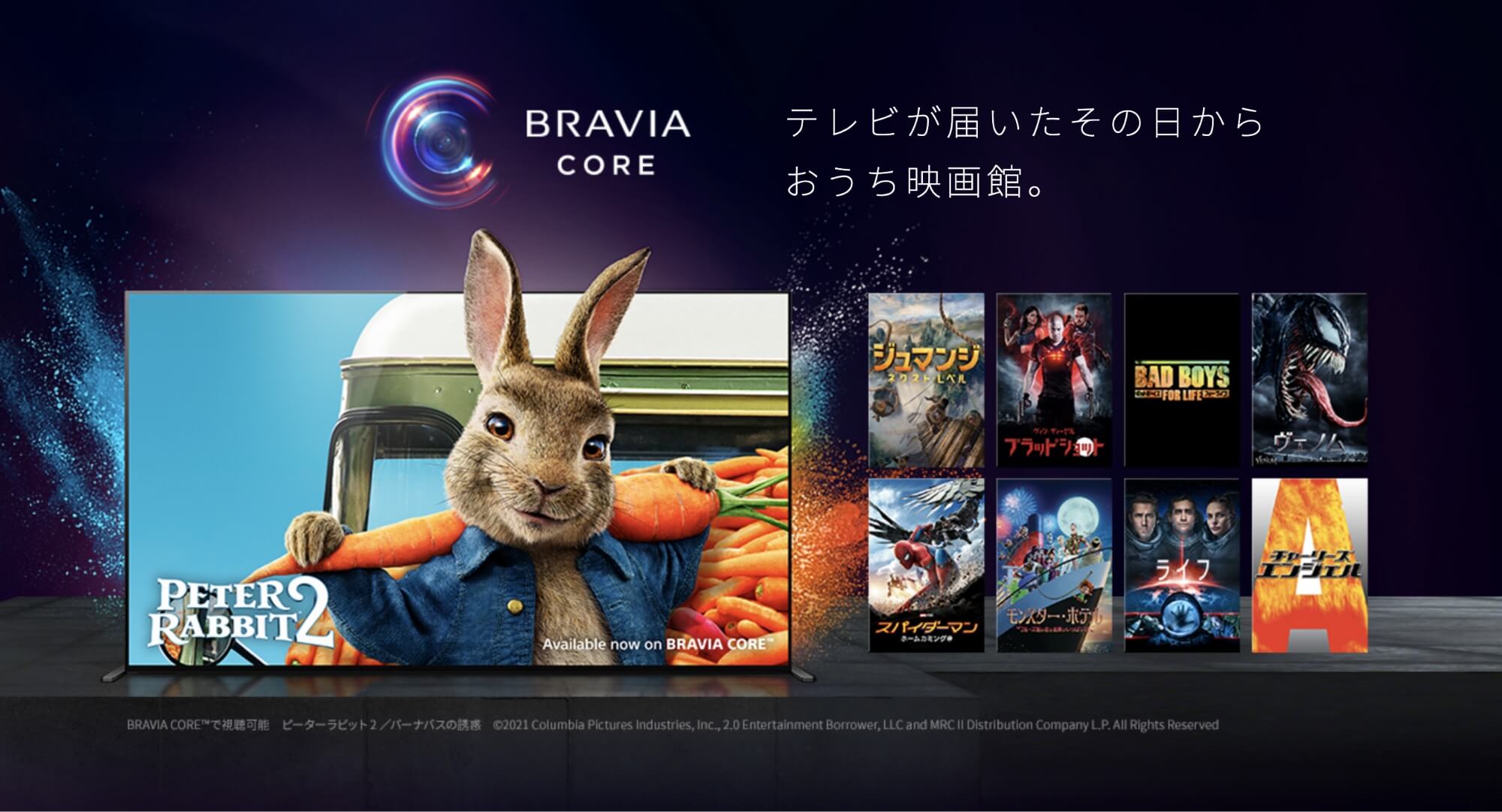 「BRAVIA CORE」は、ソニー・ピクチャーズの豊富な映画作品を2年間好きなだけご覧いただけるBRAVIA XR専用のコンテンツサービス。画質・音質にも徹底的にこだわっており、デジタル配信でありながらUltra HD ブルーレイに迫るクオリティを実現しています。