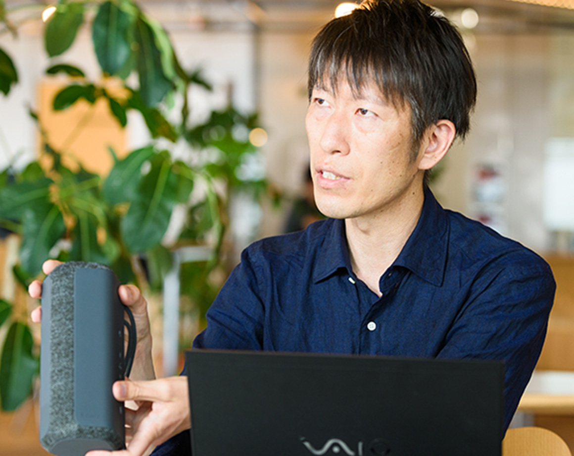 村尾:ワイヤレスポータブルスピーカーは、ふだん自宅でBGMを楽しむことに加え、休日に家族や友人とアウトドアに持ち出すといった使い方ができる製品です。今回、その新製品を開発するにあたり改めて市場を調査したところ、特にアウトドアでの利用時に聴取位置によって音体験に大きな差ができてしまうという課題があることがわかりました。スピーカーの目前にいる人はしっかり音楽を楽しめるのに、スピーカーからやや離れた位置にいる人は音質・音圧を物足りなく感じてしまうといった具合ですね。