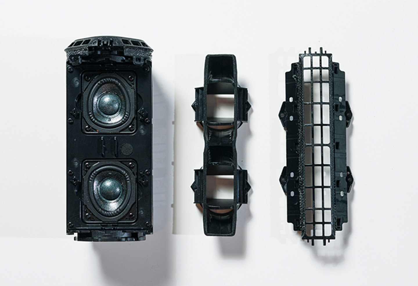ちなみに開口部やデュアルパッシブラジエーター周りの音が出るところにはファブリック素材を採用しているのですが、これも分割していない1枚の素材で実現しているんですよ。これもまた苦心したところですね。