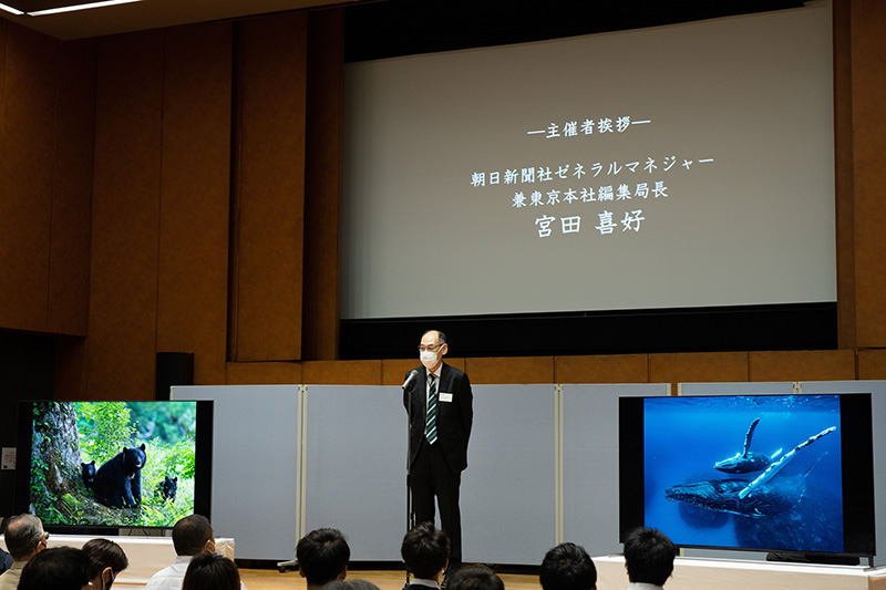 受賞式の冒頭では、朝日新聞社ゼネラルマネージャー 兼 東京本社編集局長・宮田喜好氏が主催者として登壇。昨今の社会情勢下にもかかわらず、コンテスト史上最多の応募となったことを受け、「皆さんが感染防止に配慮しつつ、少しずつ活動の幅を拡げ、動き始めたことを実感しています」と喜びの気持ちを表しました。そして、移動が制限されている中でも美しい自然の姿を写真に収めようとする象徴的な一例としてプリント部門で特選に選ばれた大野健一さんの作品『隔たり』に言及。「いわゆる絶景や珍しい生き物を被写体に選ばれる方の多いコンテストではありますが、身近な場所でも素晴らしい自然を撮影できるのだと改めて感じさせてくださいました」と語り、逆境の中でもしなやかに広がっていく表現の可能性への期待を滲ませました。