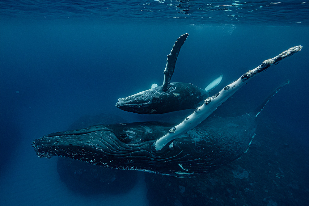 非常に穏やかな雰囲気のある写真なんですが、実は赤ちゃんクジラを守っているお母さんクジラはかなりナーバスな状態になっています。「赤ちゃんクジラに何かあったら許さないぞ」と、そういうふうに警戒しているんですね。僕自身、何度もクジラを撮っていますが、過去に撮影スタッフが赤ちゃんクジラに抱きつき、お母さんを怒らせてしまったことがあります。その時は僕も巻き込まれ、胸びれで叩かれて気絶してしまったことがあります(苦笑)。クジラの撮影はそれくらい危険なんです。