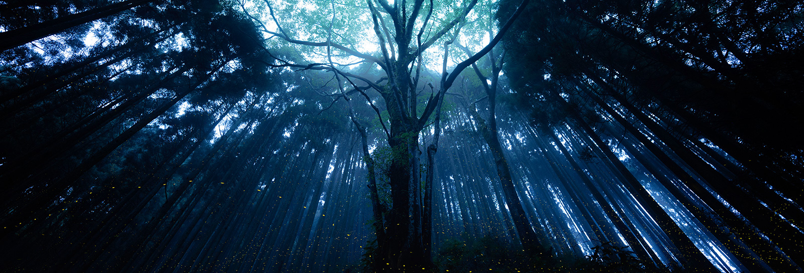 この作品は自然豊かな地元の出雲で撮影。夜の森の広がりと静寂を表現するために広角レンズを用いました。中央に大木を配置し、下から上を見上げるような構図にすることで、木々の間から漏れる光を取り入れ、大木をより強調しています。また、大木の周囲にホタルの光を散りばめることで、写真に動きを与え、自然の息吹を表現しました。全体的に対比を強く意識して撮影しています。大木と周りの木々の大きさの対比で、森の広がりを。上部の木漏れ日(明)と下部の夜の闇(暗)の明るさの対比で、森の奥行きを。木漏れ日に照らされた靄(青)とホタルの光(黄)の色の対比で、生命の神秘性を表現しています。