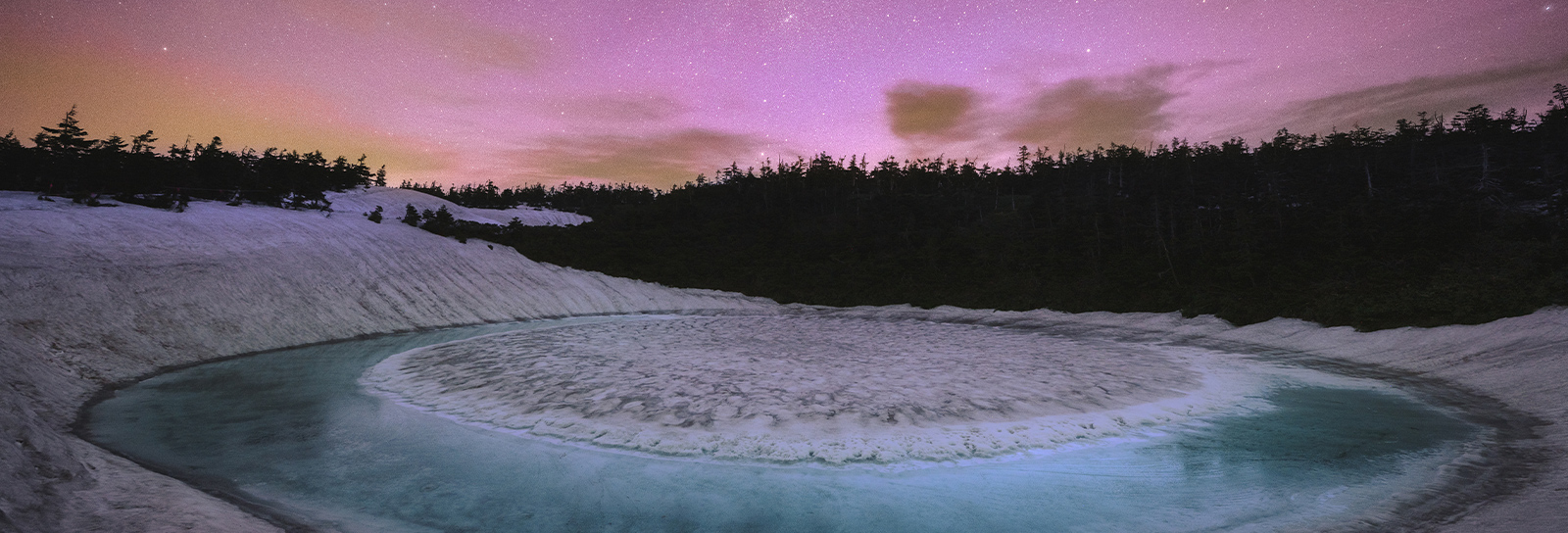 その日、太陽フレアの影響で岩手県・八幡平周辺でもオーロラが見えるかもしれないと聞いてはいましたが、まさか本当に撮影できるとは思ってもいませんでした。新潟県を拠点に活動する私がその場にいたのも偶然でした。八幡平山頂で真北にカメラを向けたところ、想像以上にはっきりと、かなりの高度までオーロラが見えていたため、少し下った「ドラゴンアイ」で撮影したのがこの作品です。日の出前、最も強くオーロラが輝いた瞬間を捉えました。