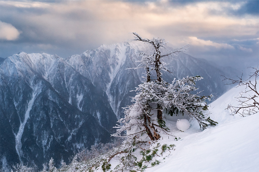 撮影地である岐阜県・西穂丸山付近では、天候が悪い日にライチョウが現れると聞いていましたが、実際に出会えるまでには長い年月がかかりました。この写真を撮影した日も、登山者が山に入るのをためらうほどの暴風と地吹雪でしたが、ホワイトアウトした背景に突然ライチョウが現れ、その瞬間、夢中でシャッターを切ったのを覚えています。