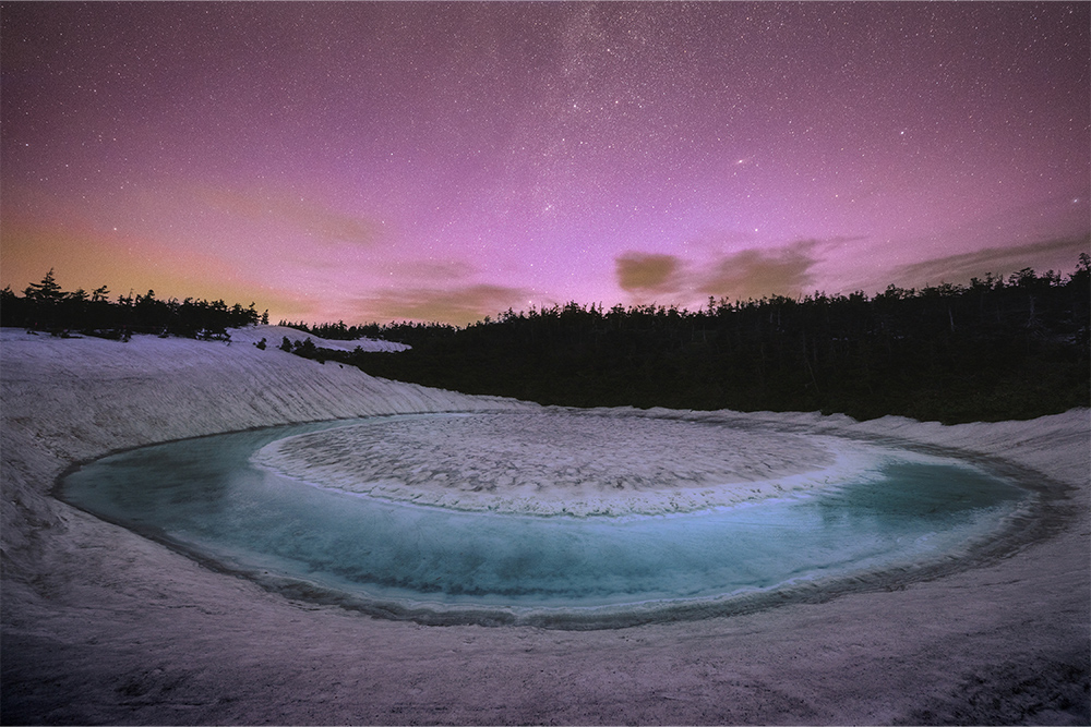 この作品は、壮大な宇宙と日本の自然、天と地が合流する瞬間を見事に捉えています。秋田県と岩手県の県境にある人気観光地「ドラゴンアイ」と低緯度オーロラの組み合わせは非常に希少で、千載一遇のチャンスをものにした荘厳な自然の姿が見る者を圧倒します。同じ写真家として「うらやましいな、こんちくしょう」と素直に思いました(笑)。もちろん、それだけではなく、画面の中央に天の川を配置する構図など、真摯な姿勢が作品全体から伝わってきます。「こんな風景が日本に存在するのだ」と教えてくれる素晴らしい一枚です。