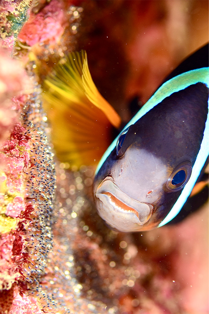 この作品では、撮影者に警戒しながらも、岩肌にいるたくさんの子どもたちに新鮮な水を送ろうと胸ビレを動かして子育てするクマノミの様子を撮影しました。魚は感情が読み取りにくい生き物ですが、こちらをじっと見つめるその目線からは、まるで子どもたちを守ろうと睨みつけているかのような強い意志を感じました。親魚と岩肌に張り付く無数の稚魚たちを一枚の写真に収めることで、ここまで育てた親魚の深い愛情が伝わるよう心がけています。