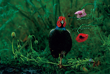 この作品を撮った日は朝から雨降りでしたが、ポピー畑で雄キジを探しながら歩いているうちに雨も止み、しばらくしたところで周囲を警戒しながら草花の種を食べている雄キジを発見。ハート型の赤い顔が正面を向くまで待っていたところ、突然振り向いて雨に濡れたポピーの茎を足で踏みつけながらカメラに向かって来てくれました。雄キジの鋭い目と野生の荒々しい動作の表現ができたと思います。カメラはα7 IVのほか、α7R IIIも愛用中。どちらも小型・軽量なことが気に入っています。