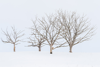 美瑛の美しい風景とキタキツネを題材にした作品を撮るべく週に3〜4日ペースで隣町の旭川から通っています。この冬は、作品の木がある丘に番い(つがい)のキタキツネが現れることが分かっていたので、重点的に様子を見に行っていました。撮影した当日、番いのキタキツネを見つけてカメラを構えたところ、なんと一匹が木に登り始めたため、慌ててシャッターを切って撮ったのがこの写真です。いったい何のために木に登ったのか分からないのですが、その場に居合わせることができたのは幸運だったと思います。今回の作品では野生動物が被写体ということでα1が活躍してくれました。α1は高画素、高速連写、高速かつ高精度なオートフォーカス等、野生動物撮影には最適なカメラと考えています。