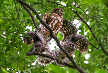アオバズクは巣立ち後も親鳥がヒナの世話を続け、数日から一週間は近くに留まります。このわずかな期間の親鳥とヒナの触れ合いを写真に残したいと考えました。夜行性の鳥なので昼間は天敵に注意しながら寝て過ごします。親鳥の周りにならぶヒナたちがコックリコックリと眠そうに羽を伸ばす姿は、まるでエンジェル。その瞬間をじっと待ち、なんとか撮影したのがこの作品です。親鳥とヒナの両方にピントが合う被写界深度を取るため、シャッタースピードを1/60秒、絞りをF18まで攻めて撮影しています。α1の連写性能は動物の一瞬の動きを捉えるには非常に有効で、手ぶれ補正も秀逸です。5010万画素の高解像度のおかげでトリミング耐性も強く、今まででは作品にならなかったシーンを取り出せるようになりました。