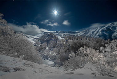 標高約1,280mにあるこの場所では、厳冬期に一面美しい樹氷が生じ、十勝岳連峰(北海道)の織りなす山々のとても美しい造形を目にすることができます。満月期に月に照らされるこの自然を撮りたいと現地に向かったところ、山々に掛かっていた雲が一気に流れる一瞬があり、イメージ通りの広大な景色を10mmの超広角レンズで撮影することができました。キラキラと宝石のように輝く雪の様子も捉えるなど、前景にもこだわっています。ソニーのカメラはコンパクトでありながら高性能・高画質で、どのような撮影環境にも対応できる点が魅力です。厳冬期の北海道においても安定した性能を発揮してくれる、耐候性の高さも心強く感じています。