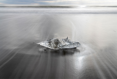 宝石のように輝くジュエリーアイス(北海道・十勝川の氷が海岸に打ち上げられたもの)を撮影したいと思っていました。撮影しながら、引き波の様子をうまく捉えることができれば、よりジュエリーアイスの輝きを引き立てることができると考え、シャッタースピードを調節しながら何度も撮影し、やっと満足できる一枚を撮ることができました。今回撮影に利用したα7R Vは高精細な描写が気に入っています。