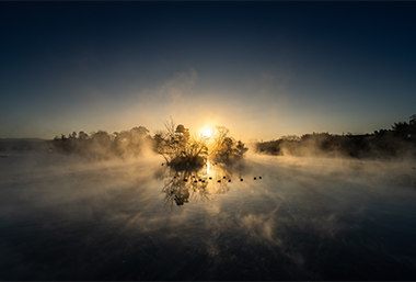 熊本県上益城郡嘉島町にある浮島神社には溜池があり、一年を通して水が張られています。朝の放射冷却が厳しくなる11月後半から、一定の条件が揃うと蒸気霧が発生します。その蒸気霧が、朝日に照らされると黄金色に輝くことから、多くの写真家がこぞって撮影に来られ、それぞれのスタイルで撮影を楽しまれています。個人的には広角レンズで浮島全体を撮影するのが好み。蒸気霧が立ちすぎず、訪れた渡り鳥の姿も撮れるくらいの日を狙って何度も通い、ようやく納得のいく一枚を撮影することができました。