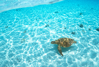 ウミガメは宮古島で大人気の海洋生物であり、あえて半水面で宮古島の海の透明度とウミガメの住む環境を撮影しました。仕事柄、海の生き物を撮影することが多く、生き物の自然な姿や生活環境を乱さないように配慮しています。撮影に使ったα7 IVは、波のある環境でも被写体を追随してくれるAF機能を気に入っています。