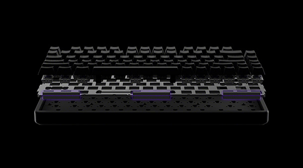 西田: 『INZONE KBD-H75』はまさにその点にこだわって作ったゲーミングキーボードです。CNC加工(コンピューター制御で金属を精度高く加工する技術)でアルミニウム製メタルフレームを削り出し、さらに全ての部品を正確に組み上げることでぐらつきを低減しました。打鍵時の衝撃を吸収し、応答性と打鍵感を向上させるガスケットマウントも採用しています。
