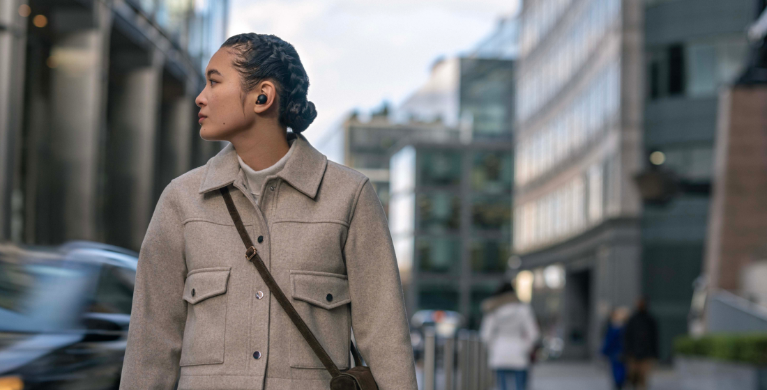 他にも、片耳でのご利用の利便性も向上しています。これまでの製品では、Auto Play*等のサービスとの連携を有効にすると、片耳だけで使う際は右側しか選べませんでした。しかし、「WF-1000XM5」では左右両方にセンサーを搭載したことにより、左右どちらの耳でも単独でお使いいただけるようになりました。例えば仕事で使うときには片耳装着で使いたいけれども、右側から声をかけられることが多いので、右を開けておいて左側だけ装着したい、というシチュエーションに対応できます。