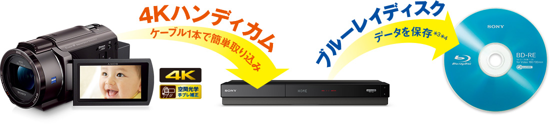 対応のブルーレイディスクレコーダー*1に保存した映像をブルーレイディスクにダビング*3すれば、バックアップとして保存*4可能。4K画質で撮影した映像をHD 画質に変換*2して保存することもできるので、4Kテレビをお持ちでないご家族やご友人にもディスクをプレゼントできます。