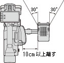 ビデオライトは正面に向けて取り付けてください。上下左右それぞれ30°ずつ照射角度が広がっていますので、ご注意ください。 |