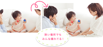 狭くて後ろに下がるスペースがない場所でも、撮りたいもの全体を画面の中におさめられます。赤ちゃんだけでなく、パパ・ママまで一緒に入ったシーンを撮れるので、家族みんなの表情まで残せます。