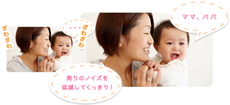 にぎやかな場所でも、周りのノイズを低減して、赤ちゃんの小さな声もはっきり録音します。赤ちゃんの寝息から、初めての「ママ」や「パパ」と発する声まで、その1つ1つをクリアに残せます。