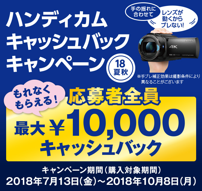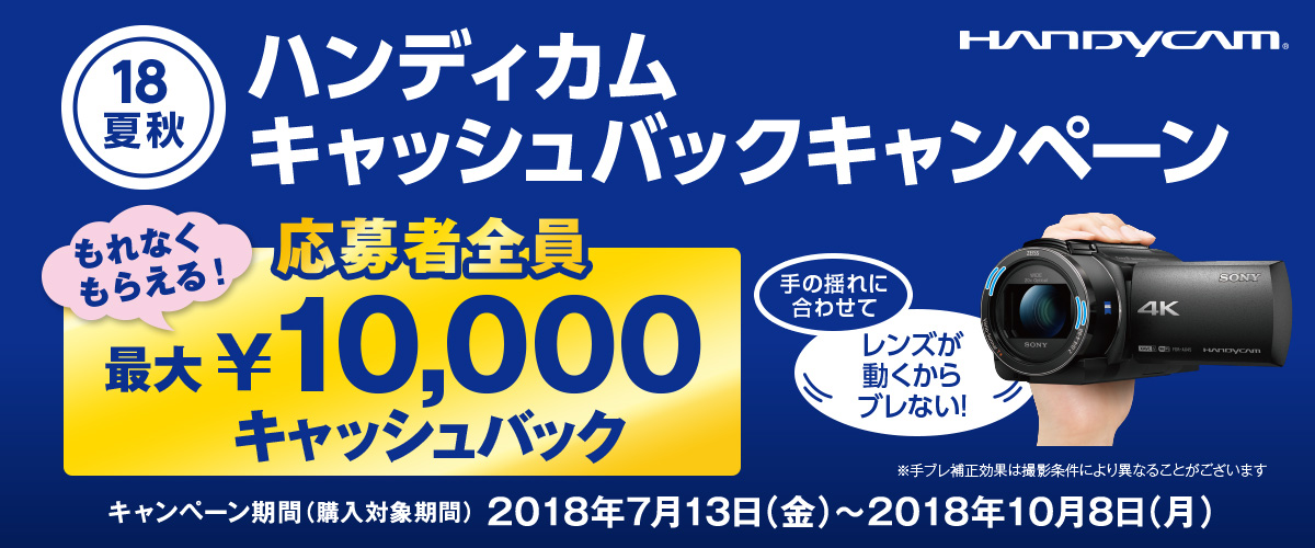 ハンディカムキャッシュバックキャンペーン(以下「本キャンペーン」)では、以下のキャンペーン期間内に以下の対象商品を購入し、当社所定の手続きに従い、以下の応募締切までに不備なくご応募されたお客様に、対象商品毎に定めた金額をキャッシュバックいたします。