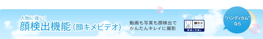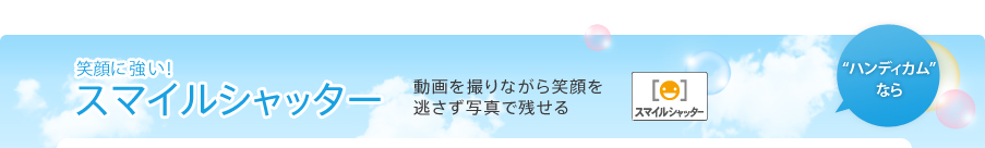 | 笑顔検出機能「スマイルシャッター」を搭載。被写体の笑顔を“ハンディカム”が判別して、自動で※1写真を撮影。動画を撮影しているだけで、素敵な笑顔の写真をきれいに残せます。さらに常時検出に設定しておけば、写真撮影時やスタンバイ時にカメラを向けても笑顔の写真が記録されます※2。 |