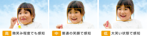 | 笑顔を感知する感度を3段階に設定可能。ふとした微笑みから大笑いまでを撮影できます。 |