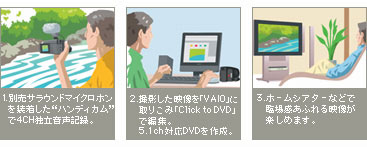 | 別売または内蔵マイク(DVD403のみ)を使って、前後左右の音をクリアに捉える、4chの独立音声記録が可能。撮影した映像を使って、ホームシアターシステムでの再生にふさわしい5.1chサラウンドDVDが作成できます*。 * 5.1ch対応DVD作成ソフトが必要です(DVD403/203を除く) ![]() |