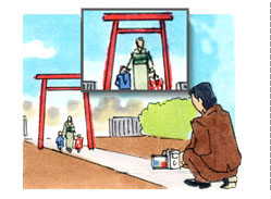 | 大きな鳥居などを背景に撮影するときは、カメラを低く構え、被写体に近づいてレンズを上にむけて撮影します。ワイドコンバージョンレンズを使用すると、さらに遠近感を強調して撮影することができます。 |