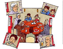 家族で祝う食事の席も七五三の大切な思い出です。神社での緊張した表情とは違った、リラックスした家族の表情を撮影してみましょう。晴れ着を汚さないか心配なママ。目を細めて見守るおばあちゃんや、祝い酒で顔の赤くなったおじいちゃん。ここではみんなが主役です。参加者一人一人に、カメラに向かってお祝いのメッセージをいただきましょう。 |