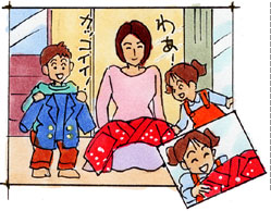 お宮参りに着ていく晴れ着を前に期待に胸を膨らますお子さんの様子を、七五三のプロローグ映像として事前に自宅で撮影しておきましょう。