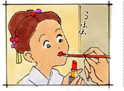 髪にはキラキラ髪飾り。そして、はじめてのほお紅、口紅。