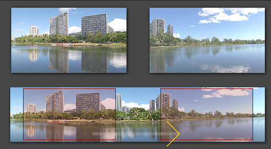 | 横長の画角を生かしたパン(カメラを横方向に動かす)にも挑戦してみましょう。注意したいのは「カメラの水平とパンのスピード」です。上下に波打つような不安定なパンは、揺れが強調されてしまいます。 |