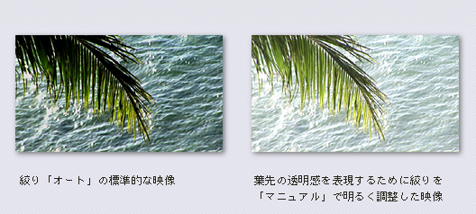 明るさの異なる部分が混在する画面で、目的の部分の明るさを調整するときには、「明るさ調整レバー」を使用して手動で絞りをコントロールします。