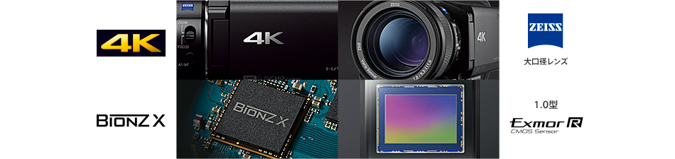 フルハイビジョンの4倍もの画素数を持つ、4K撮影が楽しめます。AX100は、さらなる高感度を達成した「1.0型 Exmor R CMOS(エクスモア アール シーモス)センサー」、センサーからの膨大な情報を高速処理する「BIONZ X(ビオンズ エックス)」、そして優れた描写力を発揮する「ZEISS(ツァイス)バリオ・ゾナーT*」レンズを搭載。卓越した高画質技術の組み合わせにより、4Kならではの高精細映像を実現しました。二度とない思い出のシーンをリアルに再現します。