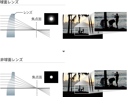非球面レンズを採用し、レンズ中心付近と周辺付近を通る光が一点に集まらないという球面収差を低減。メリハリの効いた美しい映像を実現します。