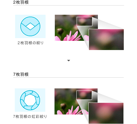 「ZEISSレンズ」に7枚羽根の虹彩絞りを採用。絞り孔を円形に近づけることで、被写体をより立体的に浮かび上がらせるとともに、背景のボケ感を味わい深く表現します。