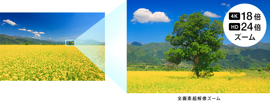 12倍の光学ズームに加えて、4K記録時は18倍、HD記録時は24倍での撮影が可能。しかも、全画素超解像ズームはひとつひとつの画素に対して周辺画素を含めたパターン分類を行い、高精細な映像を作り出すために最適処理。ズーム時に遠くの風景や人物の画質を保ったまま美しく撮影できます。